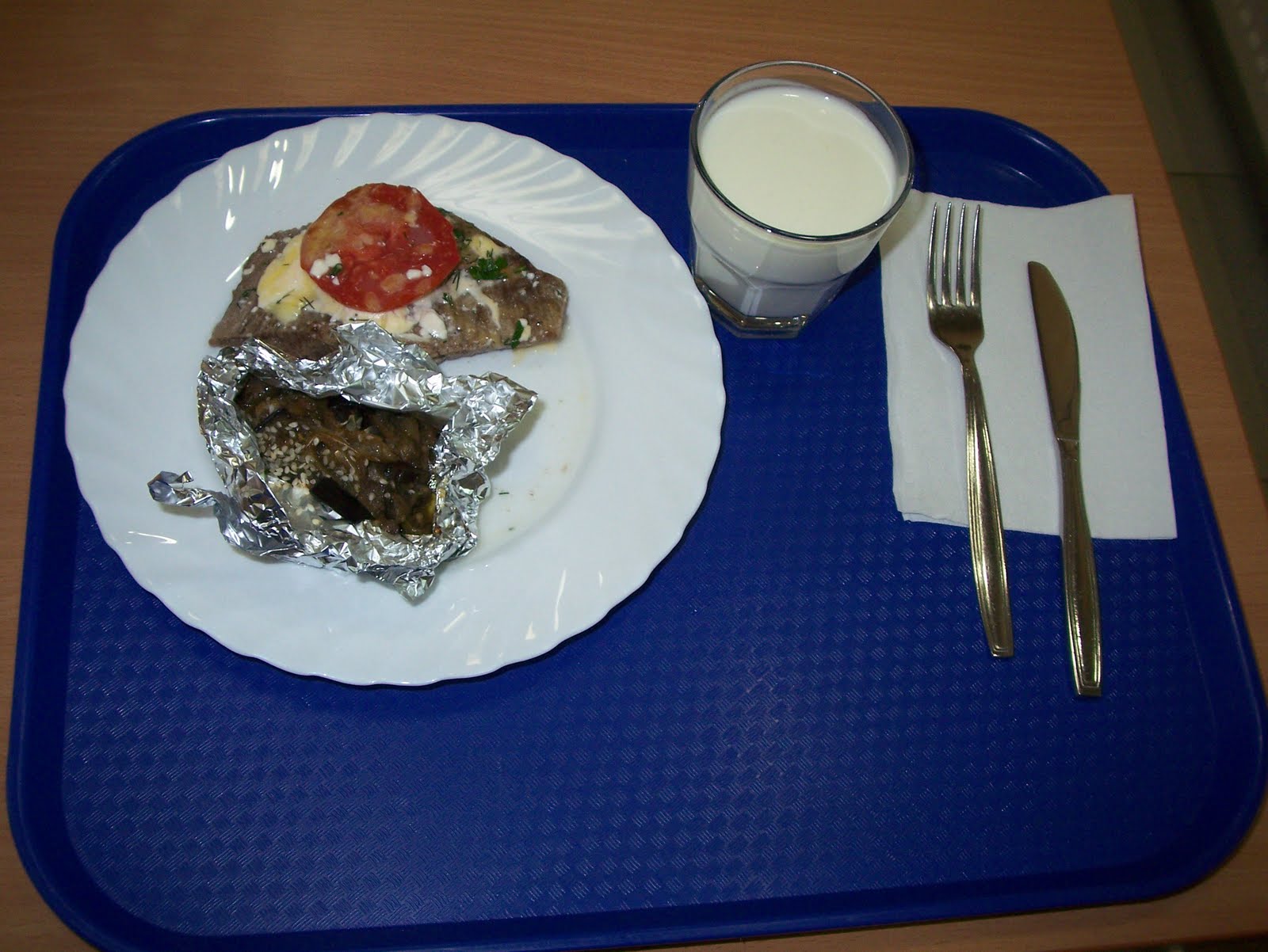 Обед на работе: Обычно я беру пол порции супа, но в этот раз меня ничего не привлекло, и я заменила суп кефиром, далее говядина запеченная с помидором и майонезом и овощи по-восточному (баклажаны, кабачки, лук, чеснок).